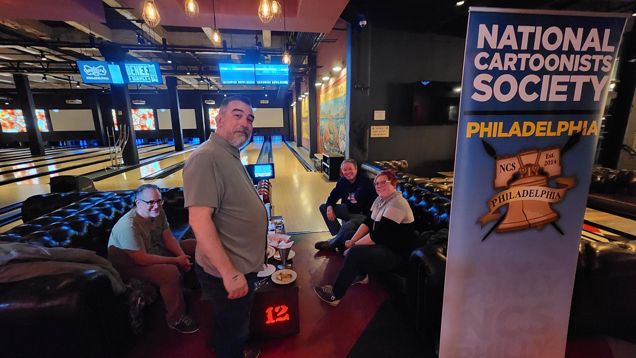 The Philadelphia chapter of the National Cartoonists Society had a small-but-mighty meetup at Brooklyn Bowl — and it was fantastic. I showed admirable personal courage. With a physique like mine, I was damned lucky no one threw a ball at me!