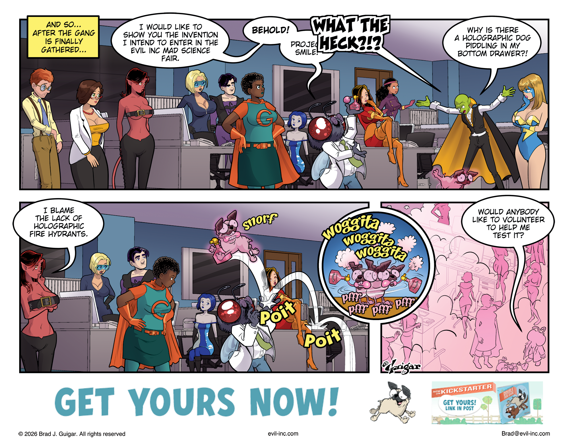 A narration box reads, “And so… after the gang is finally gathered…” A large group of employees stands across the room from left to right: Jeremy, Cassie Cruz, Desdemona, Catnip, Iron Dragon, Giant Tess, Tempest, Dr. Muskiday, Miss Match, Psy-Chick, Count Spurlock, and Lightning Lady. Dr. Muskiday, a half-fly creature mad scientist, announces he wants to enter his invention in the Evil Inc Mad Science Fair and says, “Behold! Project SMI—” before being interrupted. Count Spurlock shouts, “What the heck?!? Why is there a holographic dog piddling in my bottom drawer?!” A small pug stands urinating into Spurlock’s open lower desk drawer.