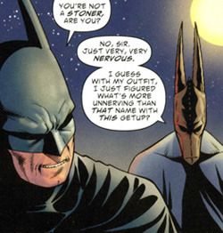 Note to Baphomet: It’s “superstitious and cowardly,” not “bookish and scholarly.” There aren’t many Gotham villains who are going to catch the reference to a character that first appeared in a late twelfth century Provençal poem and later as a term for a pagan idol in trial transcripts of the Inquisition of the Knights Templar in the early 1300s. And if those horns aren’t throwing his balance way off, I’d be amazed. Although it does remind me of that period of time in the eighties during which Batman’s ears got so ridiculously long that it took Frank Miller himself to clip them back.