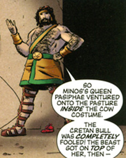 Hercules: So Mino’s queen Pasiphae ventured onto the pasture inside the cow costume. The Cretan bull was completely fooled! The beast got on top of her, then–