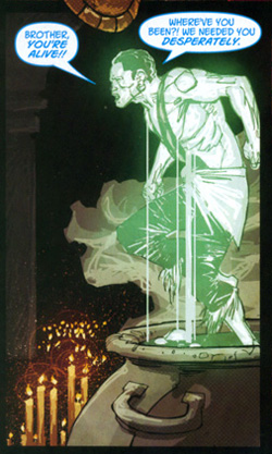 I just found another reason to dislike the new Sorceror Supreme. (As if that “juju” stuff wasn’t enough.) I must have missed this before, but he’s guided by the spirit of his dead brother who seems to eminate from a cauldron. So, now he’s not only swiping the Dr. Strange shtick, but that of yet another mystical comics character — a sorcerer who has been conjuring a ghostly guide out of a cauldron for decades! This has to stop.