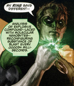 Ring: Analysis of explosive compound — laced with molecular nanobytes — reconfiguring substance of blast every .000034 milliseconds. At moment of explosio — trace elements of Kryptonite. Also active ingredient Jordan DNA, making possibility ring would override protective screen.