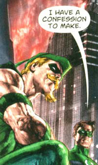 The scene opens with Green Lantern and Green Arrow, standing on a Gotham City rooftop (the ubiquity of which is discussed in the ensuing panels). Hal tells Ollie that he has a confession to make.