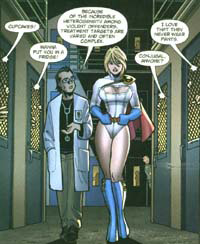 After thwarting Ultra-Humanite (See VQ rating: Ultra Humnanite for details), Power Girl drops in to the maximum-security prison to check on him. As she walks down the hall, other, supposedly meta-human criminals, comment from behind bars with such quips as: