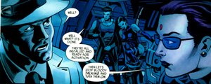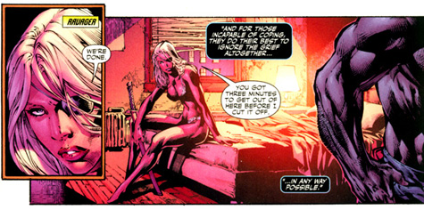 Sometimes you see a panel like this in a comic and it doesn’t hit you until three-or-four pages later. In Dark Avengers #8 Psylocke* is in a deep-sea-diver-style wet suit, accompanying a “Madison Jeffries” on an underwater mission. When she returns to the ship, she peels off the skin-tight suit. Only to reveal another equally-skin-tight costume underneath.