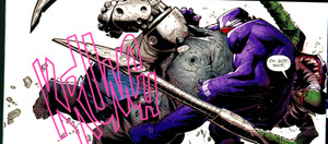 Venom takes on a roomful of D-list wannabes, dispatching each in his own inimitable way. During the scuffle, Dr. Everything places a band around Venom’s mouth so he’s unable to bite. At which point, Venom chomps Dementoid with another mouth that grows out of his stomach. Now, earlier, it was revealed that the symbiote that creates Venom could not digest a rabid squirrel (he horked it on the desk of the Daily Bugle Editor earlier), and evidently, whatever dements Dementoid is equally indigestible because after defeating General Wolfram and Hippo, the all-but forgotten Dementoid peeps for help. In the most unlikely of places.