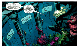 As long as we’re all wet, let’s swim over to stoic Prince Namor, allowing psychic Emma Frost access to the inside of his mind. It’s aquatic of course (please, no “water on the brain” jokes). And she floats over to see three locked doors — representing, Frost muses, his strategies for coping with the surface world: Attack, Negotiate and Sue.