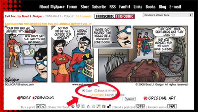 Look right below the comic and you’ll see two buttons: Color and Black-and-White. Click on your choice to see the comics on this site in that format.
