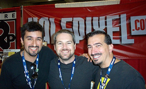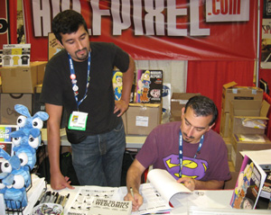As I begin stammering, my eye is caught by some familiar faces around this young ‘toonist. One is Gloria Calderon Kellett, Dave Kellett’s wife. Another is David Scales, an actor and friend of Dave and Glo, who I met in New York at a production of one of Gloria’s plays. And… And…