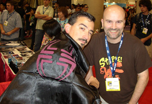 I’ve never been given so many things as I have at Comic Con. I mean, you guys really made me feel special. Most of it was simply thoughtful and indicative of the in-jokes we share. For example, Wes Molebash brought me a copy for SkyMall magazine from his flight in (autographed!). I also received a copy of a newspaper that used “Champing at the bit” as a headline. My friend, Keith, who works at NC Soft, the makers of City of Villains, brought me a cool City of Villains cape (pictured to the right). My sons have been running around in the cape every since I got home. Sometimes they even give me a turn. The one that kills me is that someone — and I have no idea who — left me a Green Lantern ring and a pen that projects the Bat Signal when you press a button. I left the table for a bathroom break, came back, and saw the swag setting on the table between Kris Straub and me. I immediately began coveting it.