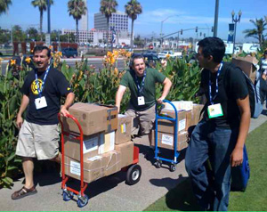 Two more old friends, Bill Barnes and Gene Aubaum, co-creators of Unshelved, were onhand for Comic Con. They were exhibiting in the aisle prior to ours in the Independent Press Pavilion. Jim Demonakos, who runs my favorite convention of the year, Emerald City Comic Con, was hanging with the Unshelved boys, too, and stopped over for a chat. On Wednesday night, as Kris and I arrived in the parking garage with more than a dozen heavy boxes, Bill offered the use of his dolly (in addition to Kellett’s), and what was going to be a nightmare became a snap. I’m always excited to see Bill. But when I saw him come around the corner with a second dolly, I could have kissed him. Bill — wisely — declined.