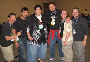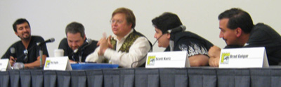 I found it fascinating that, although the five of us were absolutely lockstep on some issues, there were others — retail sales vs. direct Web sales, for instance — that we had wildly divergent views on. Phil, for example, actively encourages Girl Genius readers to buy their books from a retail outlet — Amazon, bookstores, comic shops — because he feels this has earned him a reciprocal relationship at the retail level. I’ve always asked you guys to buy directly from me for the simple fact that I make more money when you do that. I have to say, hearing Phil’s logic gave me a lot to think about, though. If it gives you any indication, look at the photo below to see our reaction to Phil’s explanation. Phil Foglio…. The E.F. Hutton of Webcoimics.