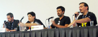 The second panel was aesome. It was the four authors of the How To Make Webcomics book doing a live version of the Webcomics Weekly podcast. It was supposed to end at 7, but we were having so much fun, we burned through for another 45 minutes. We went so late, we returned to find the exhibit hall locked. (That’s where the David Malki / Magnolia Porter story starts up.)