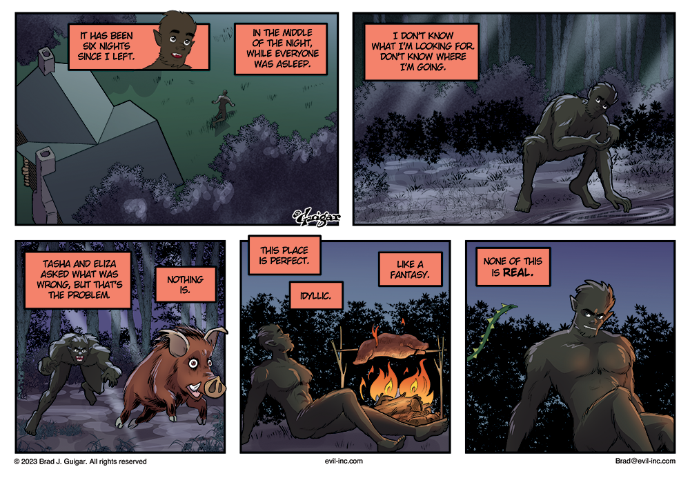Over several scenes of hiking, hunting, and camping in a forest, we hear Mister Howell's internal monologue: It has been six nights since I left. In the middle of the night, while everyone was asleep. I don't know what I'm looking for. Don't know where I'm going. Tasha and Eliza asked what was wrong, but that was the problem. Nothing was. This place is perfect. Idyllic. Like a fantasy. None of this is real.