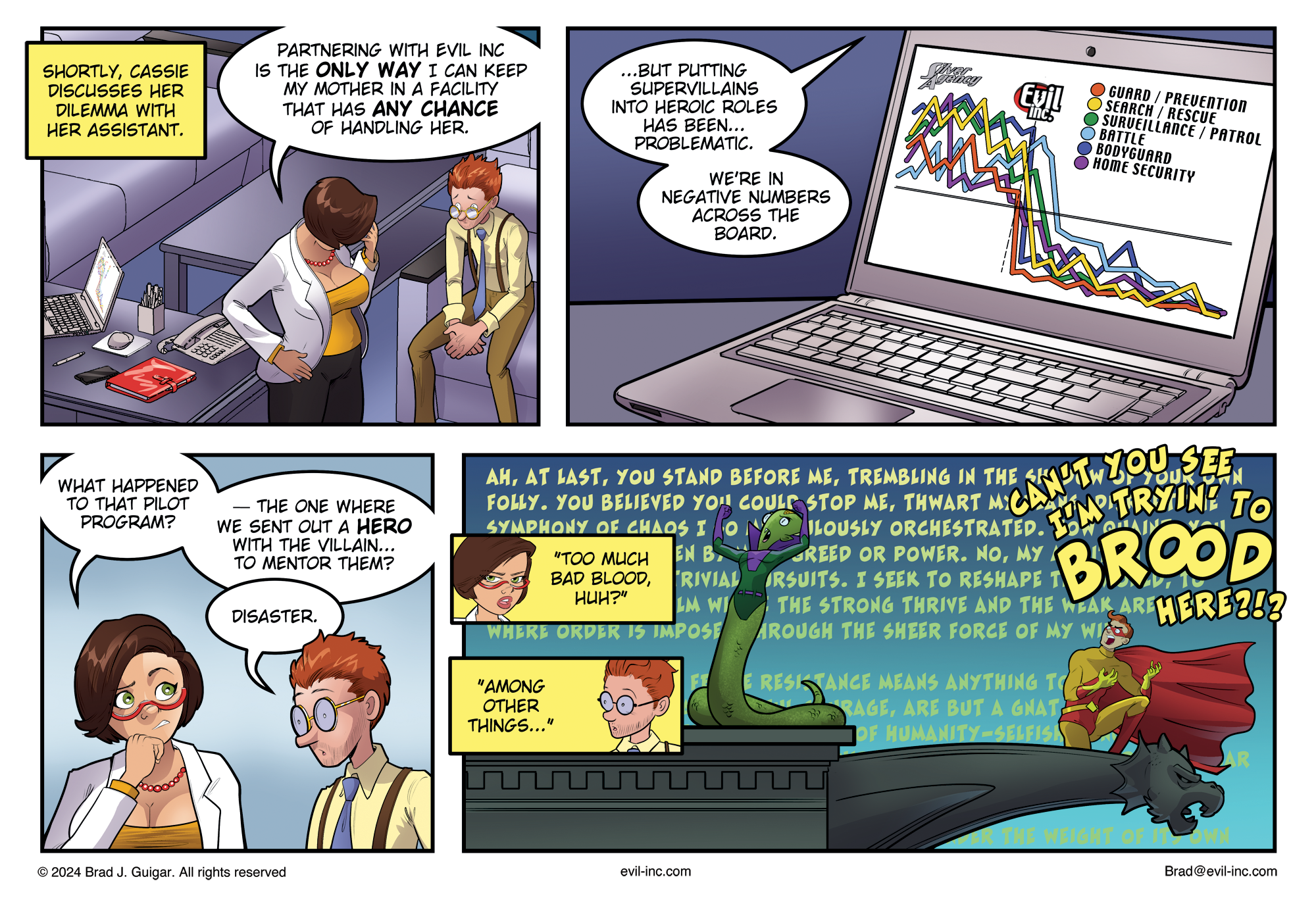 Cassie talking to her assistant, Jeremy, in her office: "Partnering with Evil Inc is the only way I can keep my mother in a facility that has any chance of handling her."