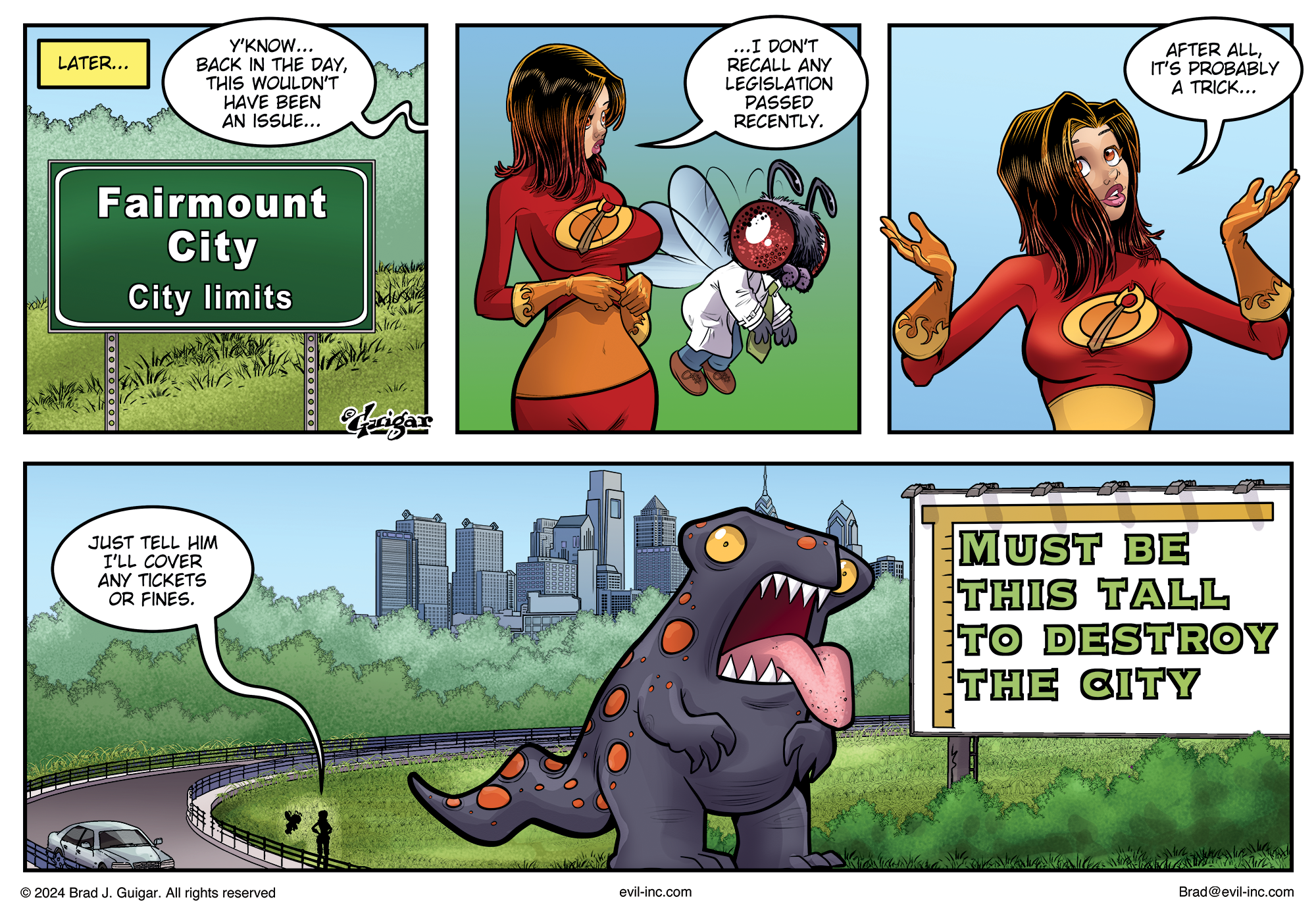 Dr. Muskiday and Miss Match look on as a giant-sized creature, looking nervous, stands by a large sign just outside the city. The sign reads: "Must be THIS TALL to DESTROY the CITY."