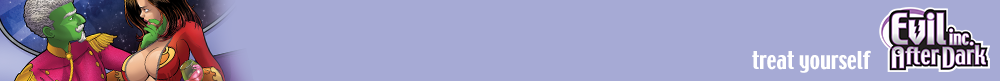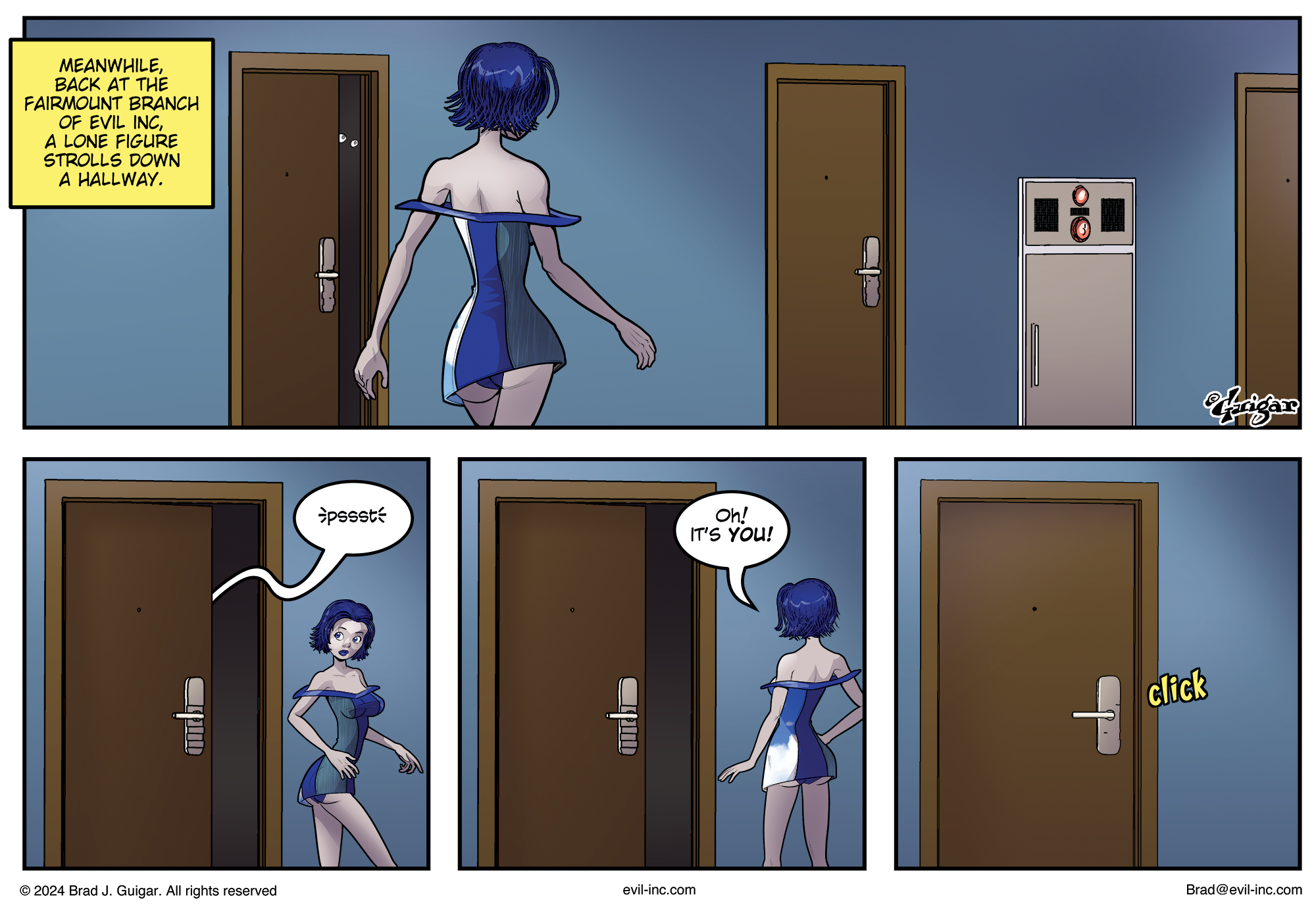 (Narration box reads: "Meanwhile, back at the Fairmount branch of Evil Inc., a lone figure strolls down a hallway.")