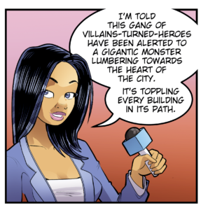 Today, Cassie Cruz's group of ner’er-do-well former villains (and one hasbeen hero) try to stop the giant creature currently rampaging towards the city.