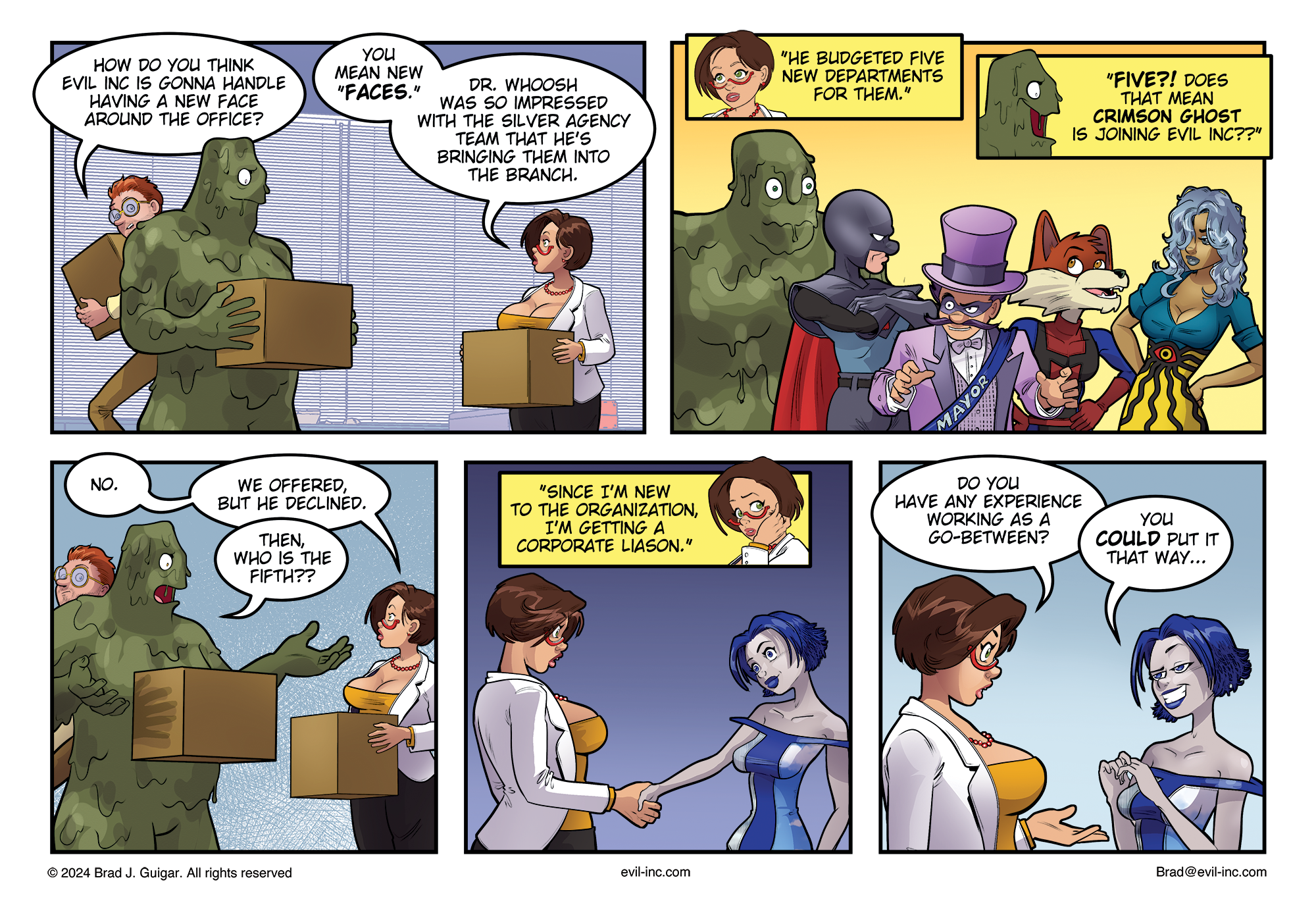 Transcript of Evil Inc comic by Brad Guigar (Nov. 28, 2024): Panel 1 (Setting: Jeremy and Glue Trap stand in an office hallway. Jeremy is still stuck to Glue Trap’s back. They are helping Cassie pack.) Jeremy: “How do you think Evil Inc is gonna handle having a new face around the office?” Cassie: “You mean new ‘faces.’ Dr. Whoosh was so impressed with the Silver Agency team that he’s bringing them into the branch.” Panel 2 Scene shows the Silver Agency team: Glue Trap, Crimson Ghost, Night Mayor, Faux Fox and Mallochio) Cassie: “He budgeted five new departments for them.” Glue Trap: “Five?! Does that mean Crimson Ghost is joining Evil Inc??” Panel 3 Cassie: “No. We offered, but he declined.” Glue Trap: “Then, who is the fifth??” Panel 4 Cassie: “Since I’m new to the organization, I’m getting a corporate liaison.” Panel 5 Cassie: “Do you have any experience working as a go-between?” Tempest (grinning suggestively): “You could put it that way…” (Comic by Brad J. Guigar. Text at the bottom: evil-inc.com)