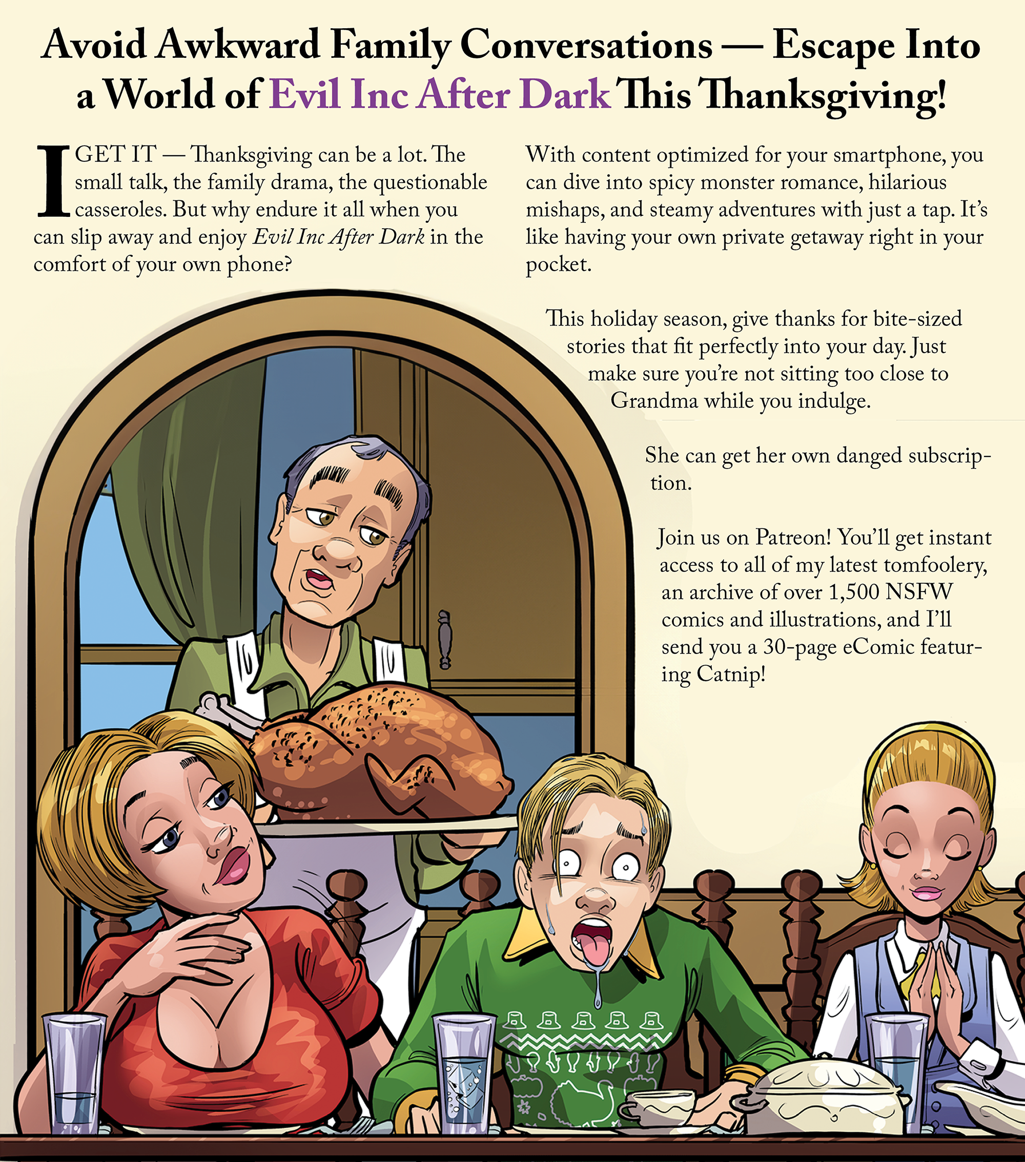 Join us on Patreon! You'll get instant access to all of my latest tomfoolery, an archive of over 1,500 NSFW comics and illustrations, and I'll send you a 30-page eComic featuring Catnip!