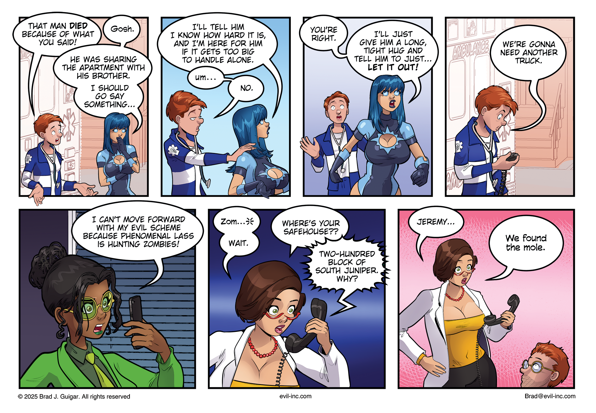 "I can’t move forward with my evil scheme because Phenomenal Lass is hunting zombies!"
