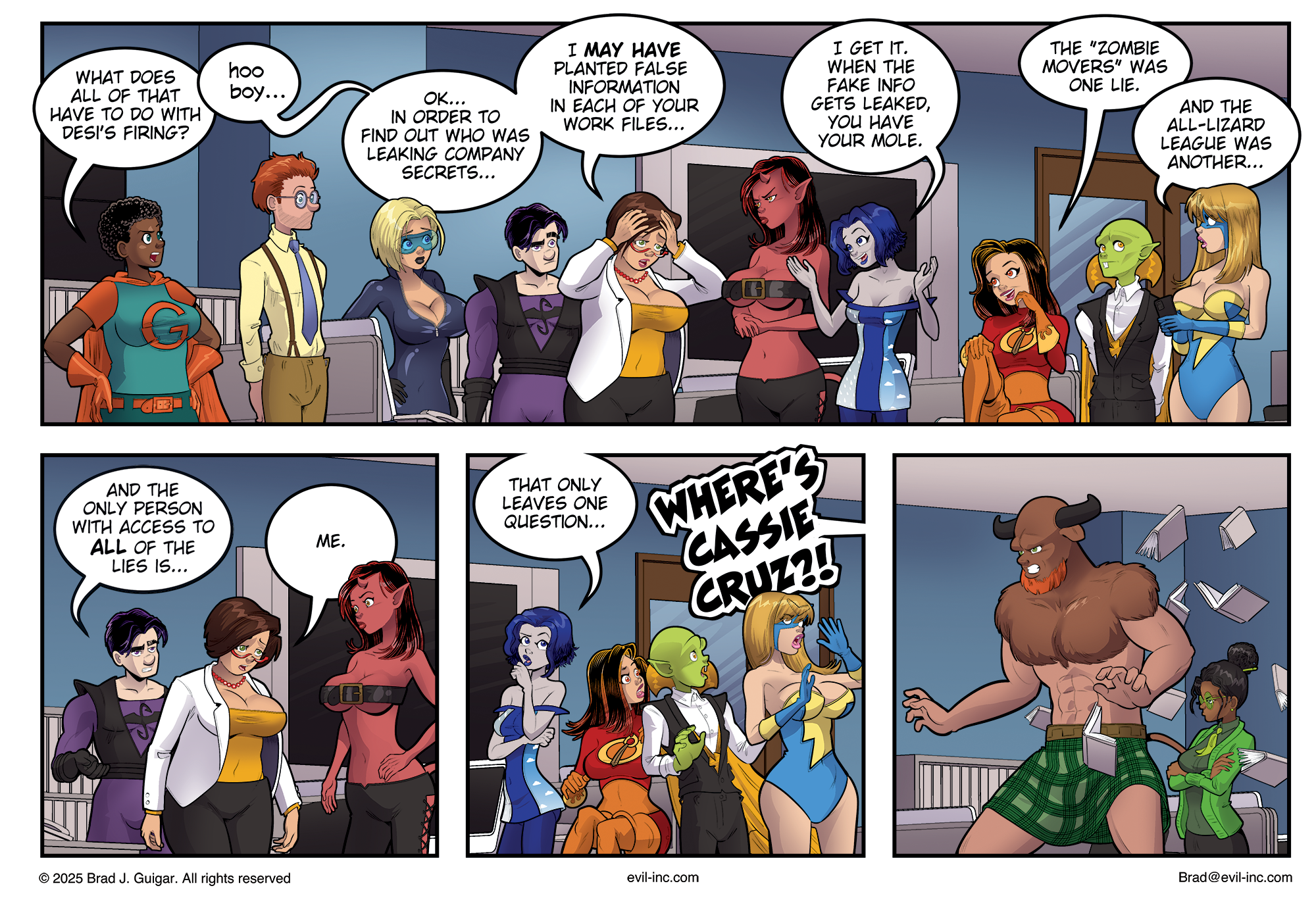 Just as devilgirl Desi is about to be escorted out of the office, Cassie Cruz’s trusty assistant rushes in to stop Desi’s termination! She might not be the mole because a second “lie” has been leaked to the superheroes!