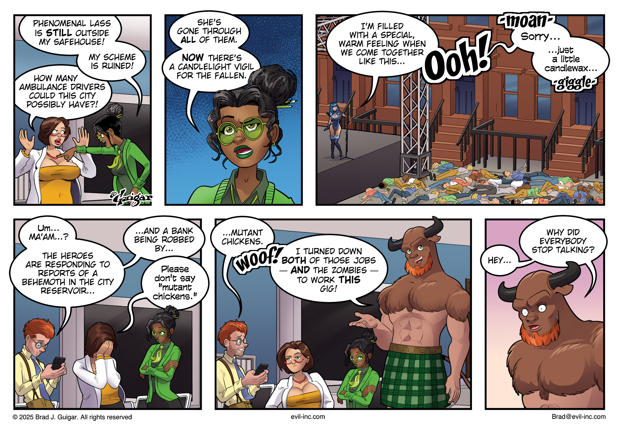Jeremy (reading from phone): “Um… Ma’am…? The heroes are responding to reports of a behemoth in the city reservoir… And a bank being robbed by…”