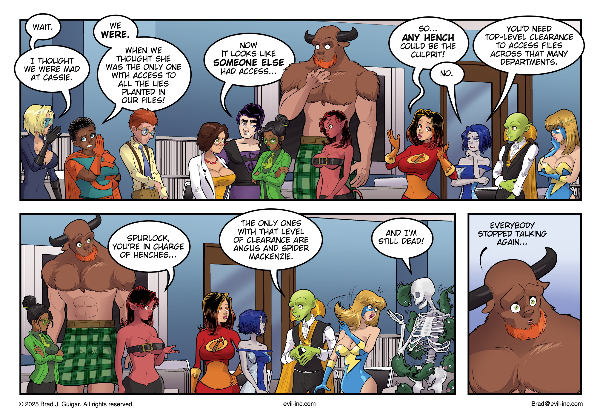 Panel 1: (Several characters are standing in a room, discussing a mystery involving file access.)