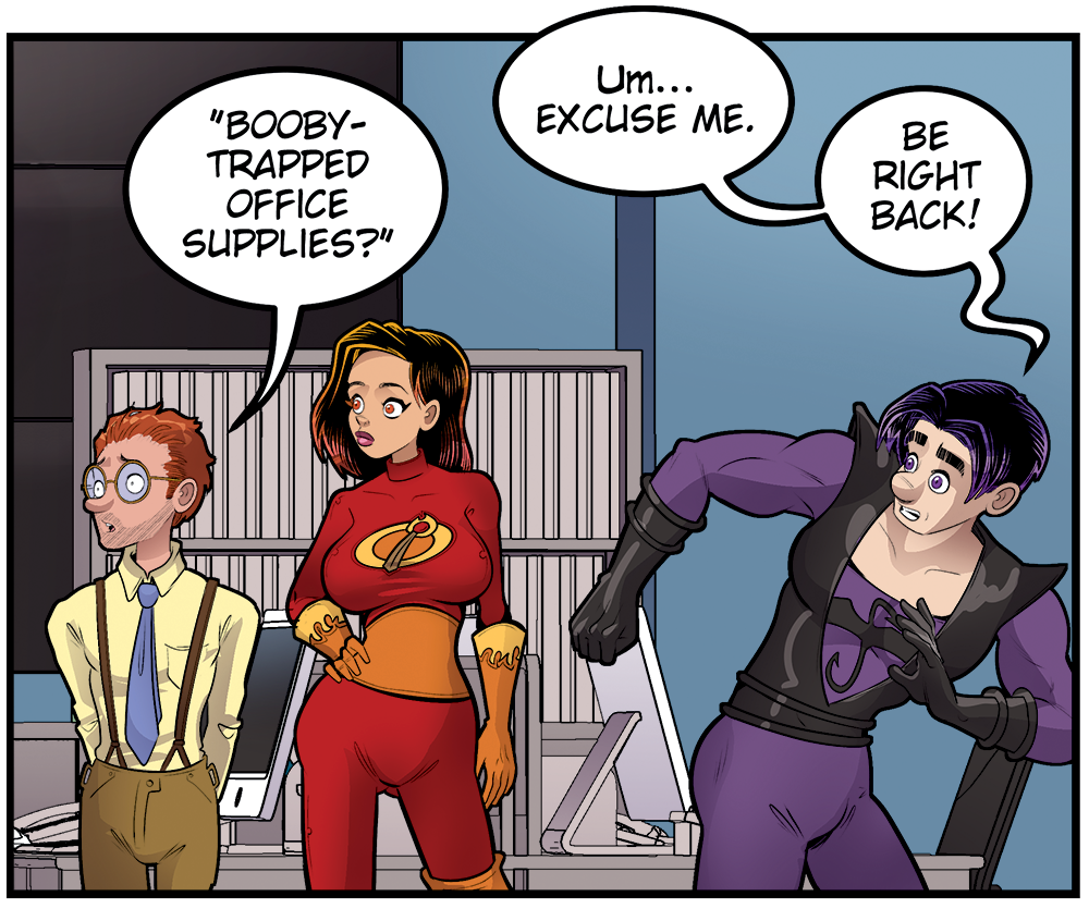 [Panel 6: Elsewhere in the office - Jeremy sitting at a desk suddenly reacts with Spider-Man style effects floating around his head]