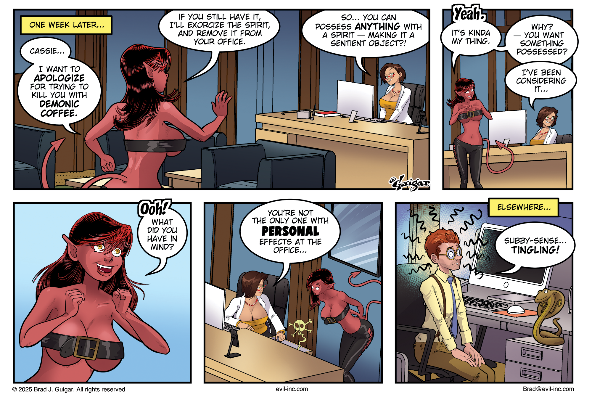 Weeks after trying to kill her colleague, Cassie Cruz, with “demonic coffee,” Desi reappears with an apology. Offering to exorcize the lingering spirit from Cassie’s office, Desi reveals her unusual talent: the ability to possess objects with spirits, giving them sentience. Intrigued, Cassie hints at her own plans—possibly involving a personal item at her desk.