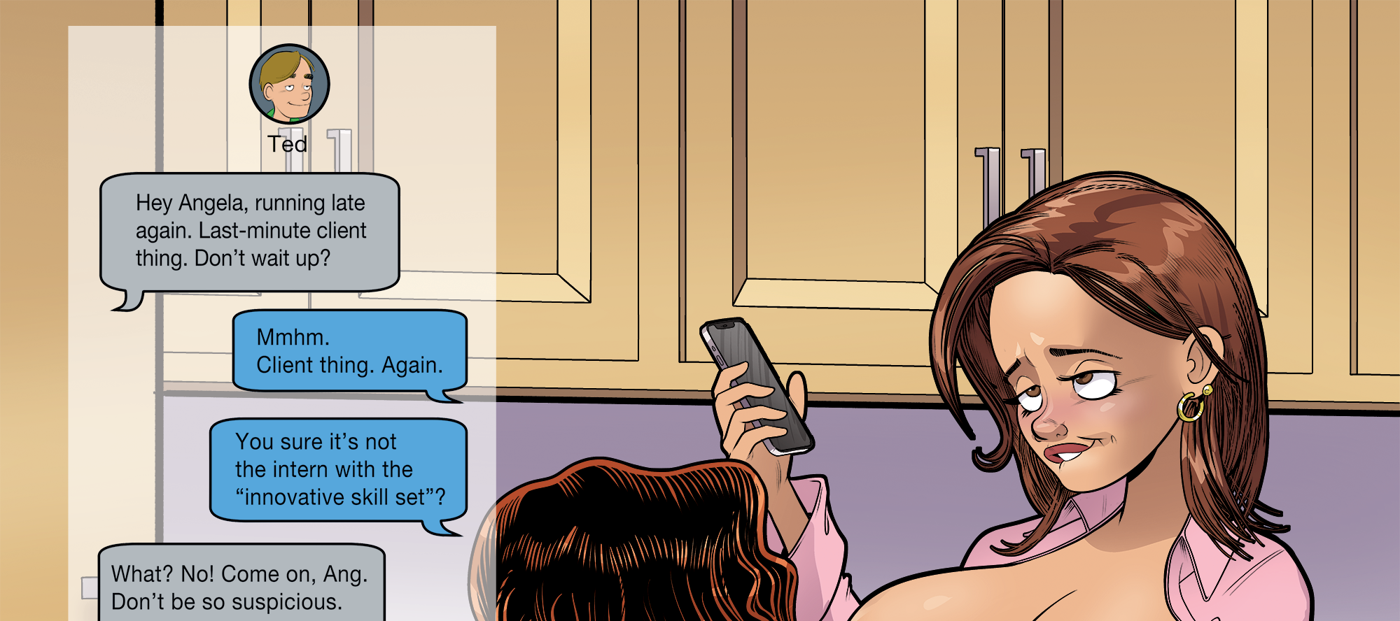 In the microfic, a woman suspects that her husband is cheating on her with an intern. However, when Captain Scarr, the lusty, busty space pirate, intercepts the text message, she decides to intervene.