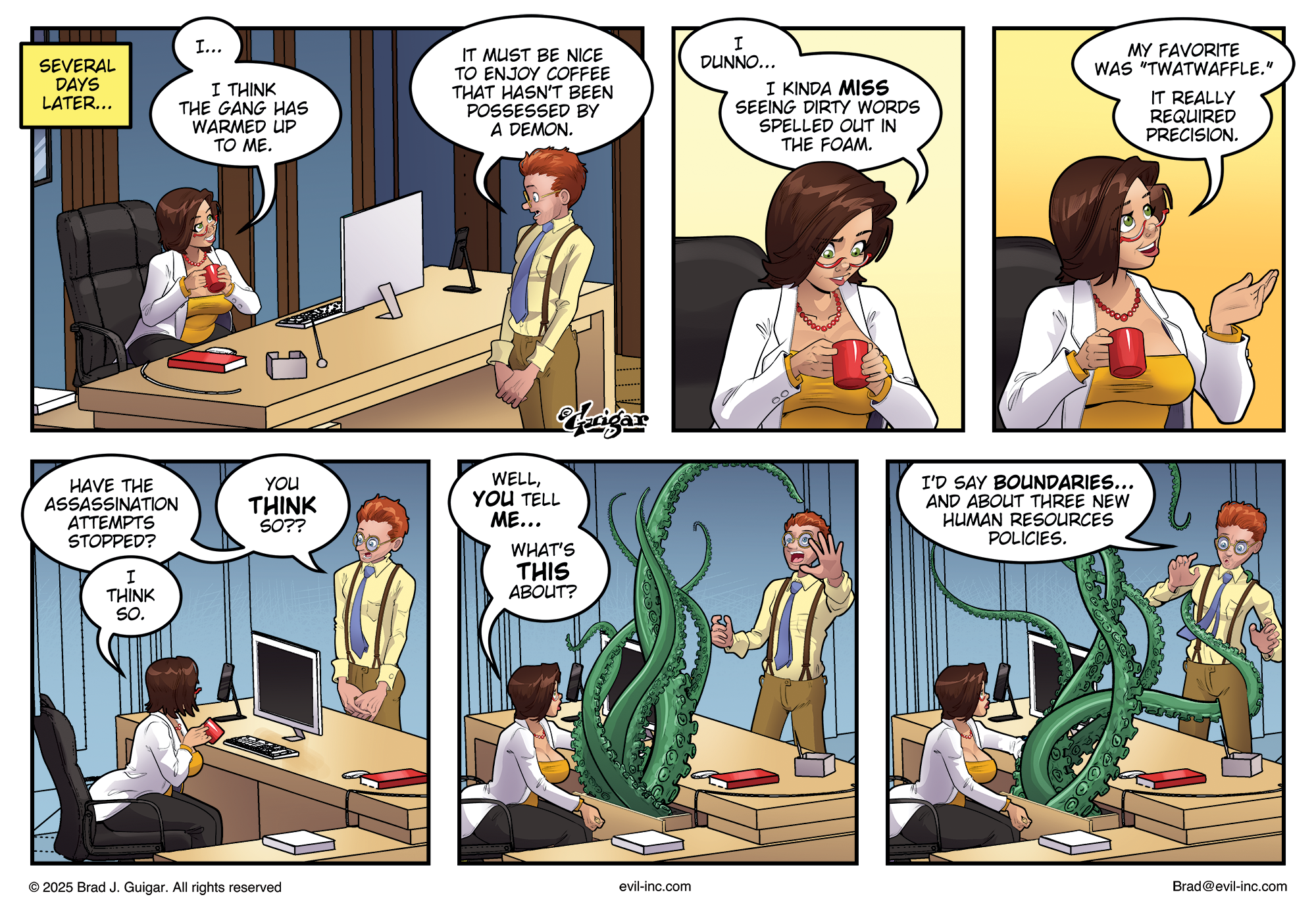 After a blurry night of karaoke, Cassie Cruz is beginning to feel at home at Evil Inc. While demon-possessed beverages and assassination attempts marked her early days, Cassie now enjoys more peaceful moments at her desk—often with a cup of coffee in hand and her assistant Jeremy nearby. As the two reflect on their evolving workplace dynamics, it becomes clear that “normal” is a relative term in the world of corporate villainy.