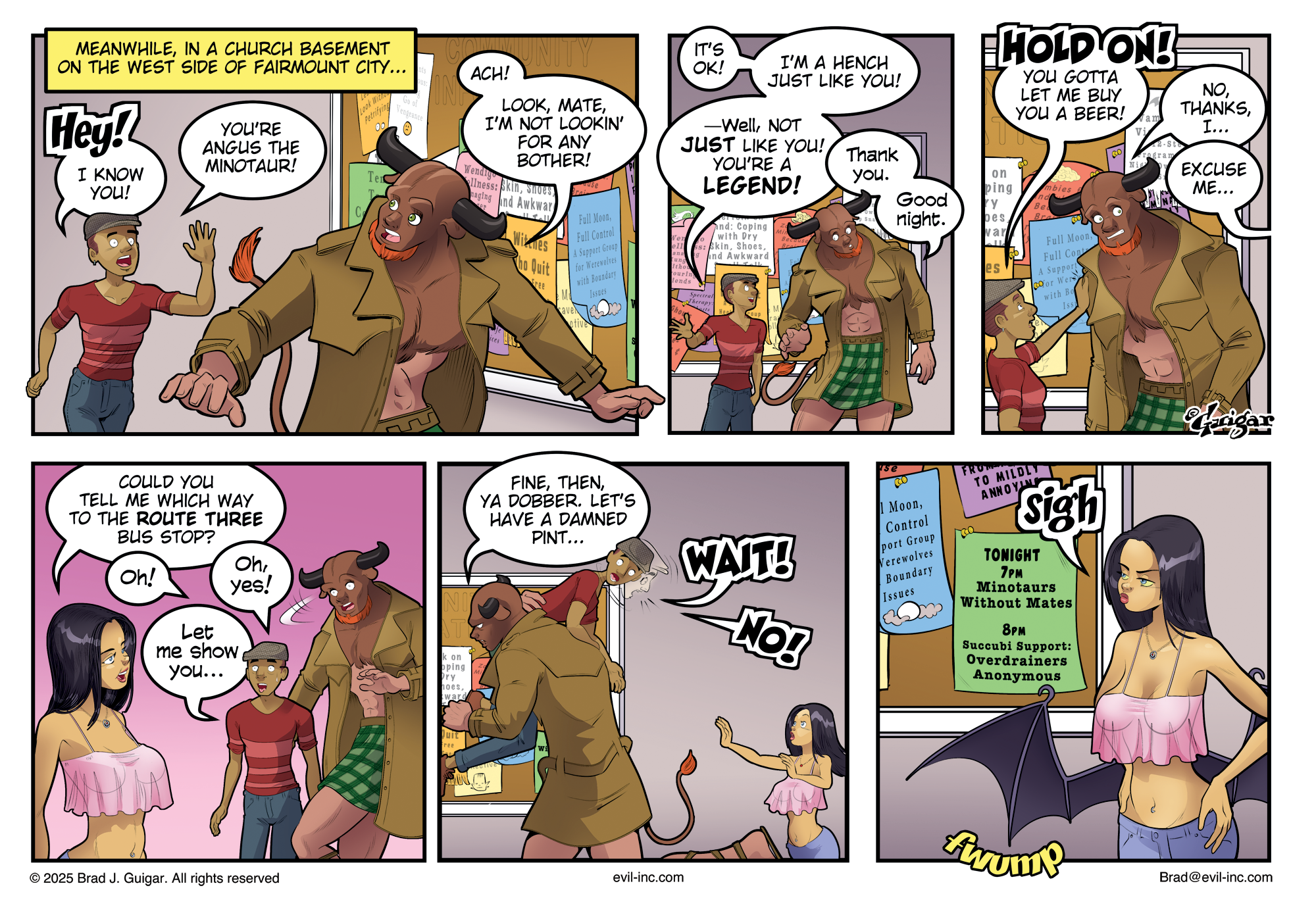 (Scene: A church basement on the west side of Fairmount City. A young man excitedly recognizes Angus the Minotaur.)