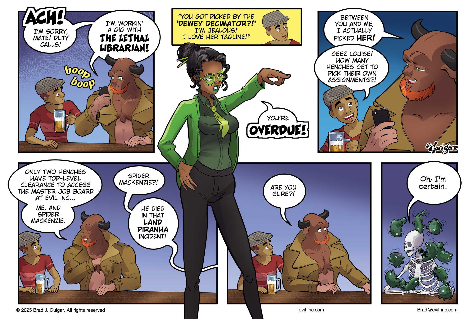 Angus: "Only two henches have top-level clearance to access the Master Job Board at Evil Inc... Angus: "Me, and Spider Mackenzie."