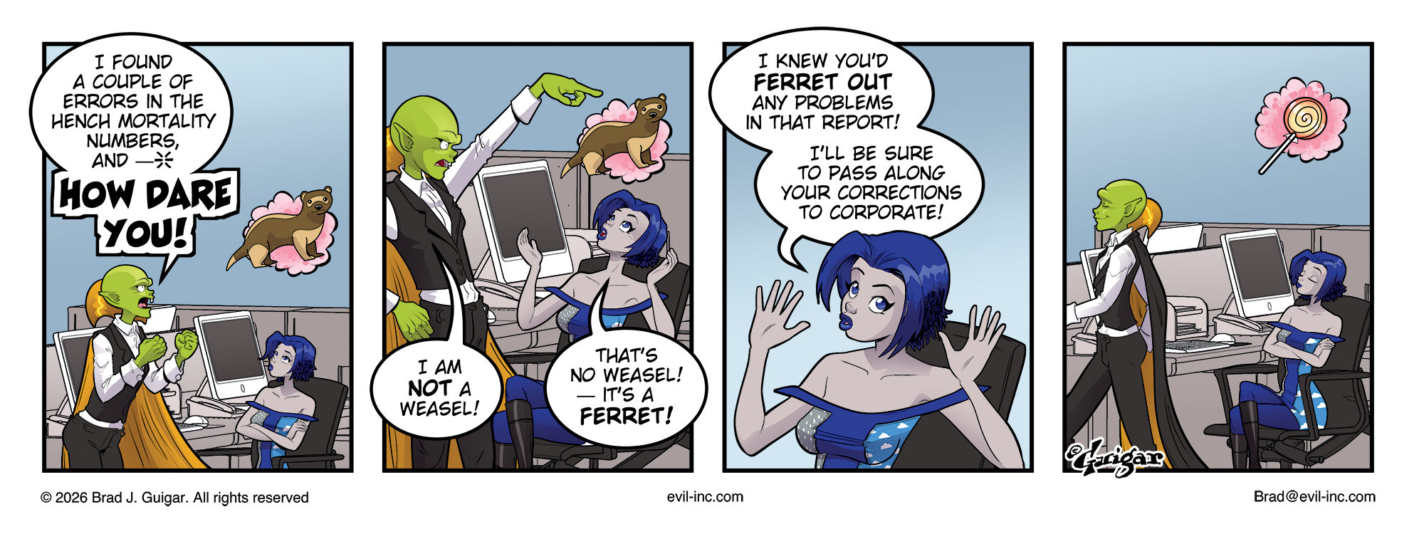 Four-panel office comic featuring Count Spurlock, pointing angrily, and Tempest, a young woman with short hair, seated casually at a desk chair. In panel one, Count Spurlock stands beside her, saying he found “a couple of errors in the hench mortality numbers” and then shouting “How dare you!” He has seen a weasel in Tempest’s emotion cloud (an aftereffect of Project SMILE). “I’m no weasel,” he insists. Spurlock points emphatically toward a small fluffy creature perched in Tempest’s cloud while Tempest gestures upward and protests, “That’s no weasel! — It’s a ferret!” In panel three, Tempest raises both hands innocently and tells him, “I knew you’d ferret out any problems in that report! I’ll be sure to pass along your corrections to corporate!” In the final panel, Spurlock walks away proudly while Tempest reclines smugly in her chair. A spiral lollipop now floats in her emotion cloud.