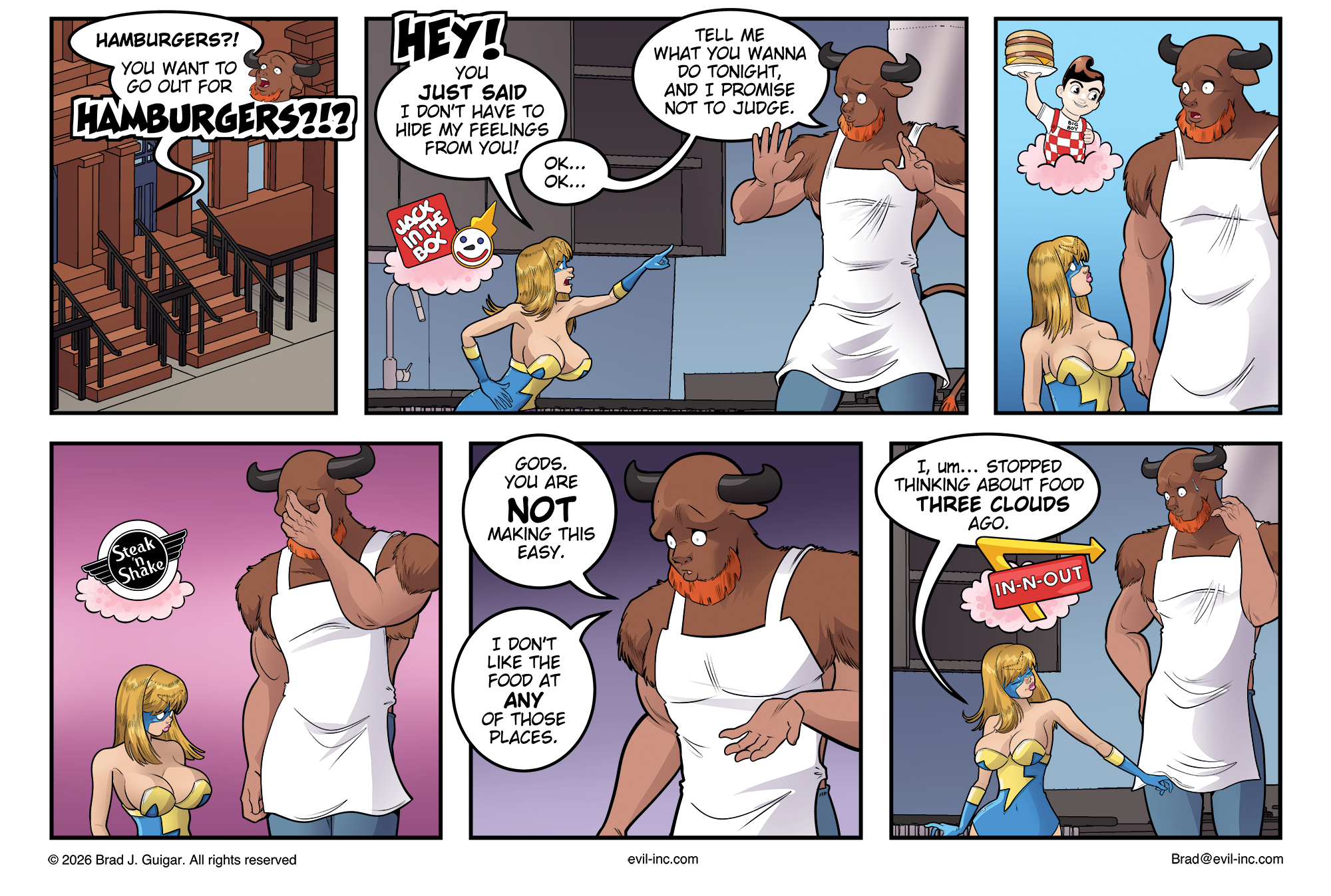 A six-panel comic featuring Lightning Lady, a blonde superhero in a blue-and-yellow costume, and her boyfriend Angus, a muscular minotaur wearing a white apron. Angus reacts loudly when she suggests hamburgers. She reminds him he said she could be honest, and he encourages her to share what she wants without judgment. As she hesitates, thought bubbles show fast food options like Jack in the Box, Steak ’n Shake, and In-N-Out. Angus grows increasingly stressed, facepalming and admitting he dislikes those places. In the final panel, Lightning Lady claims she stopped thinking about food while still gesturing, with a thought bubble indicating otherwise, as Angus is taken aback.