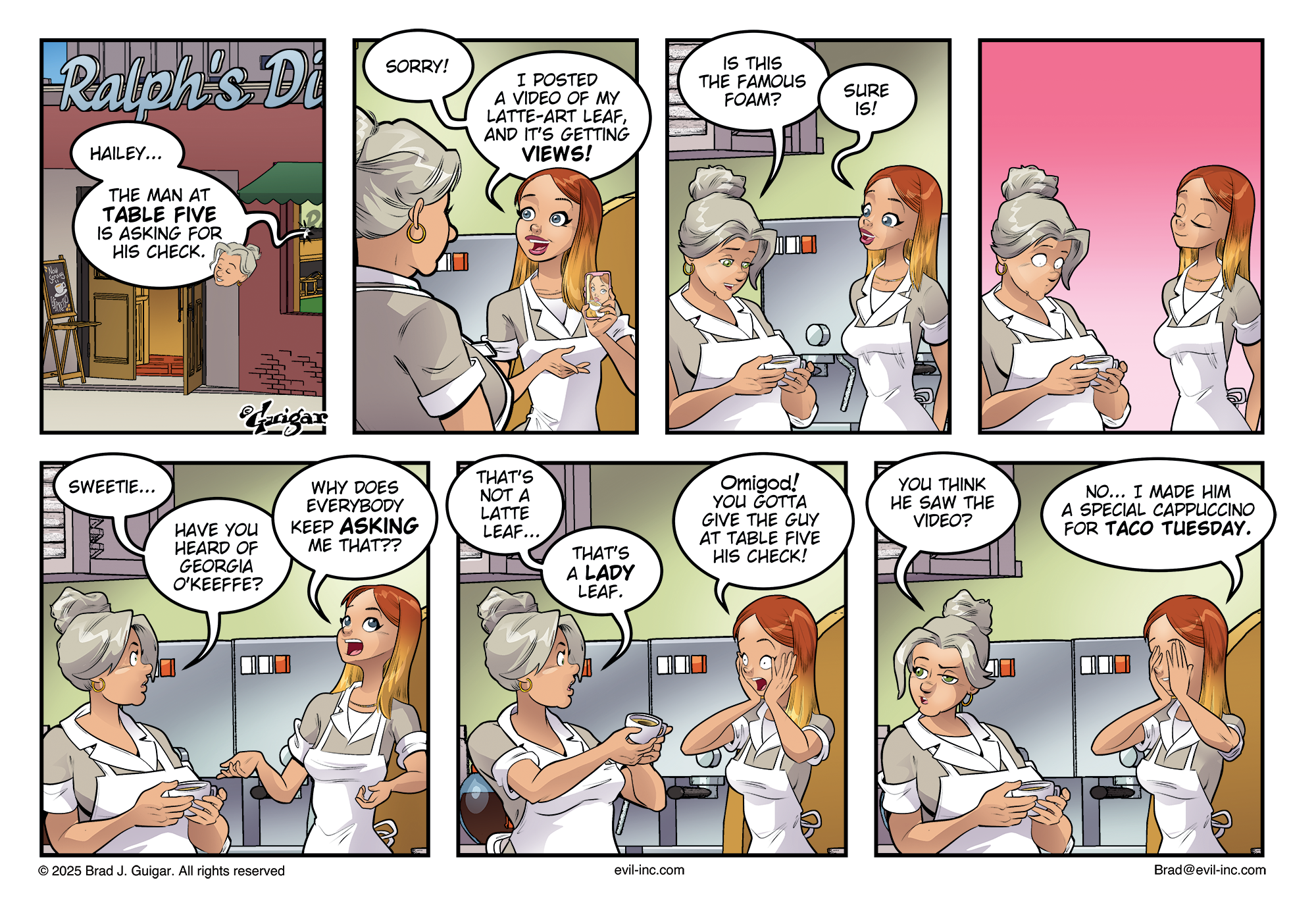 In the intro to Chapter 17, we return to Ralph's Diner, which you may remember from an earlier storyline — here and here. The new waitress, Hailey, is riding high on a burst of online fame after posting her latest latte-art creation — a “leaf” that’s getting serious traction. Unfortunately, her coworker Rose spots something a little more… suggestive in the foam. As Hailey scrambles to serve a customer who may have received one of her more questionable cappuccinos, panic brews faster than the espresso.