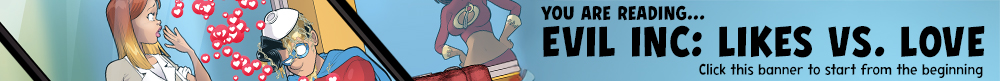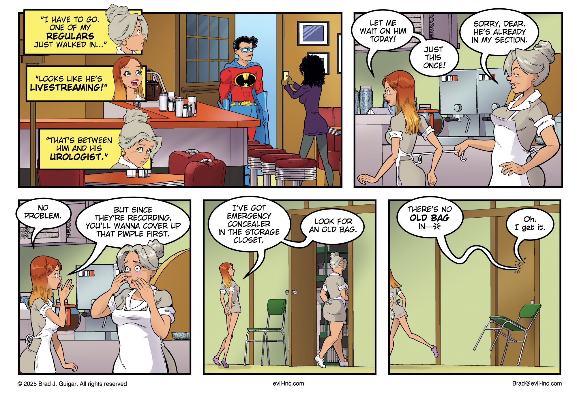 A comic sequence inside Ralph’s Diner. Hailey excitedly asks Rose to let her wait on Captain Heroic, who has just walked in with Yazmine Velour filming him on her phone. Rose declines, explaining he’s already seated in her section. Hailey suggests Rose hide a pimple since they’re recording. Hailey directs her to emergency concealer in the storage closet and tells her to “look for an old bag.”
