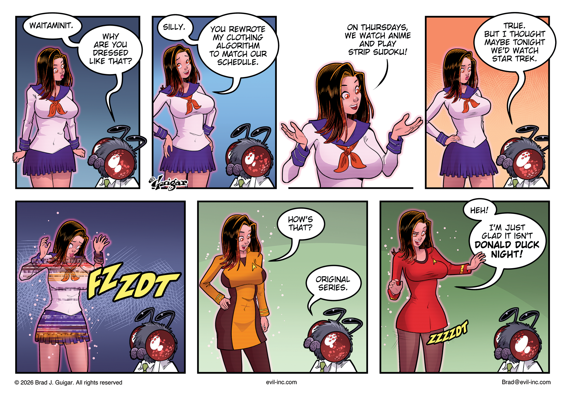 Comic strip featuring Holo-Clone Miss Match and Dr. Muskiday, a small mad scientist with insect-like antennae and a red, spotted face. In the first panel, Miss Match, dressed in a revealing anime-style schoolgirl outfit with a purple skirt, pink top, and red scarf, says, “Waitaminit.” Dr. Muskiday asks, “Why are you dressed like that?” In the second panel, she explains, “Silly. You rewrote my clothing algorithm to match our schedule.” In the third panel, she continues, “On Thursdays, we watch anime and play strip Sudoku!” In the fourth panel, Dr. Muskiday responds, “True. But I thought maybe tonight we’d watch Star Trek.” In the fifth panel, Miss Match begins to transform, glowing and pixelating with the sound effect “FZZDT.” In the sixth panel, she is now dressed in a Star Trek Original Series-style uniform with a gold top and dark pants, asking, “How’s that?” Dr. Muskiday replies, “Original series.” In the final panel, she transforms again, now in a tight red Star Trek uniform, and jokes, “Heh! I’m just glad it isn’t Donald Duck night!” Dr. Muskiday looks alarmed.