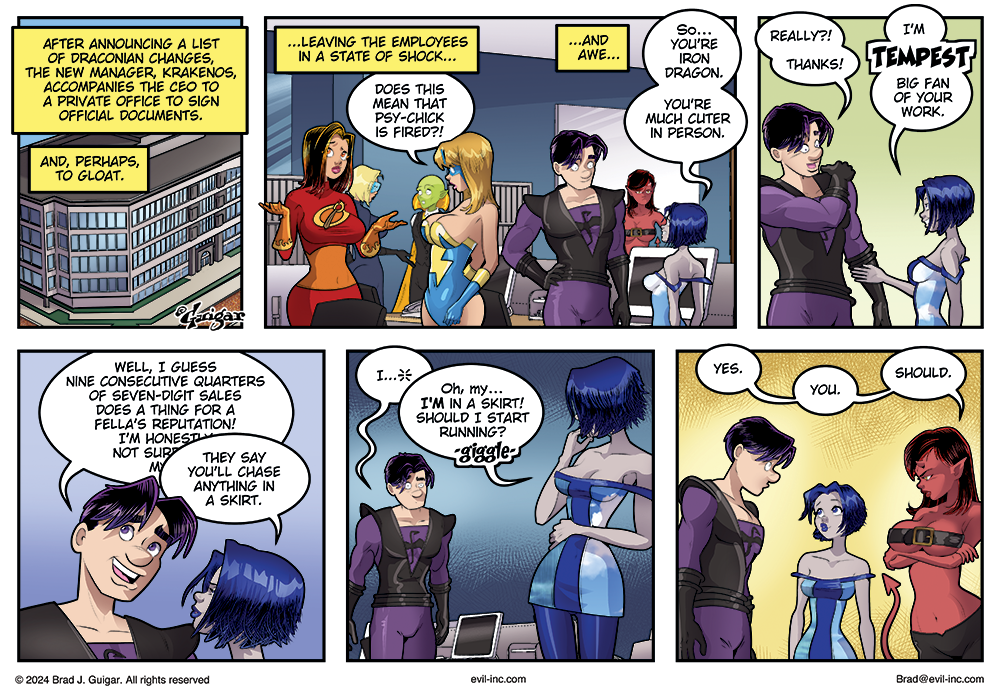 Narrator: After announcing a list of draconian changes, the new manager, Krakenos, accompanies the CEO to a private office to sign official documents. And, perhaps, to gloat.