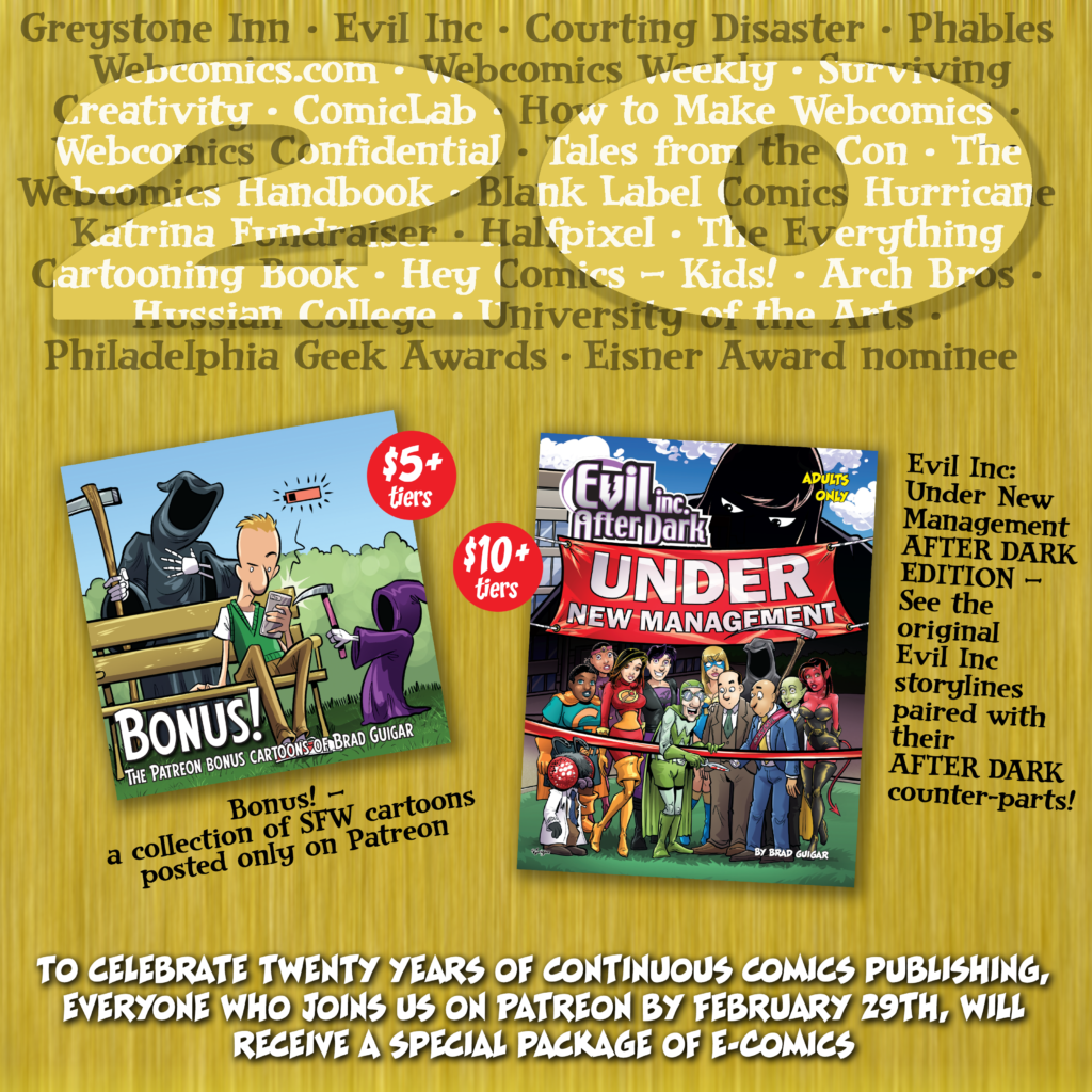 To celebrate 20 years in comics, I'm offering a Special Offer to Patreon backers at the $5 level and higher! Everyone at the $5 level and higher by February 29, 2020, will receive a 54-page eBook containing the Bonus comics I've been posting exclusively on Patreon! Everyone at the $10 level and higher by February 29, 2020, will receive the special After Dark edition of Evil Inc: Under New Management. In this 134-page digital edition, the main Evil Inc storylines have been matched up with the corresponding After Dark storylines.