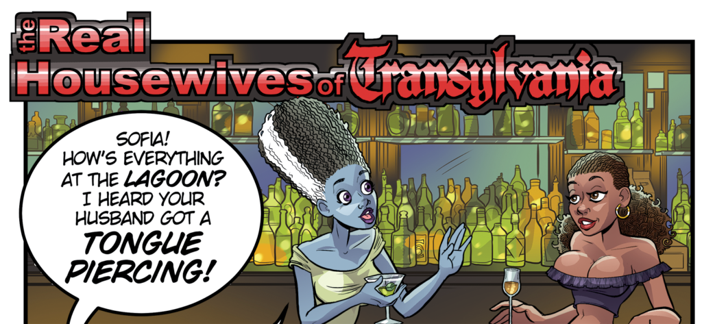 If ever there were a perfect month to join us on Patreon, it's October. So far, members got a free copy of the 88-page Halloween eComic that sells for $1.99 AND the new 33-page NSFW Halloween eComic, "Scared Stiff", which sells for $4.99. All that and the return of the Real Housewives of Transylvania...