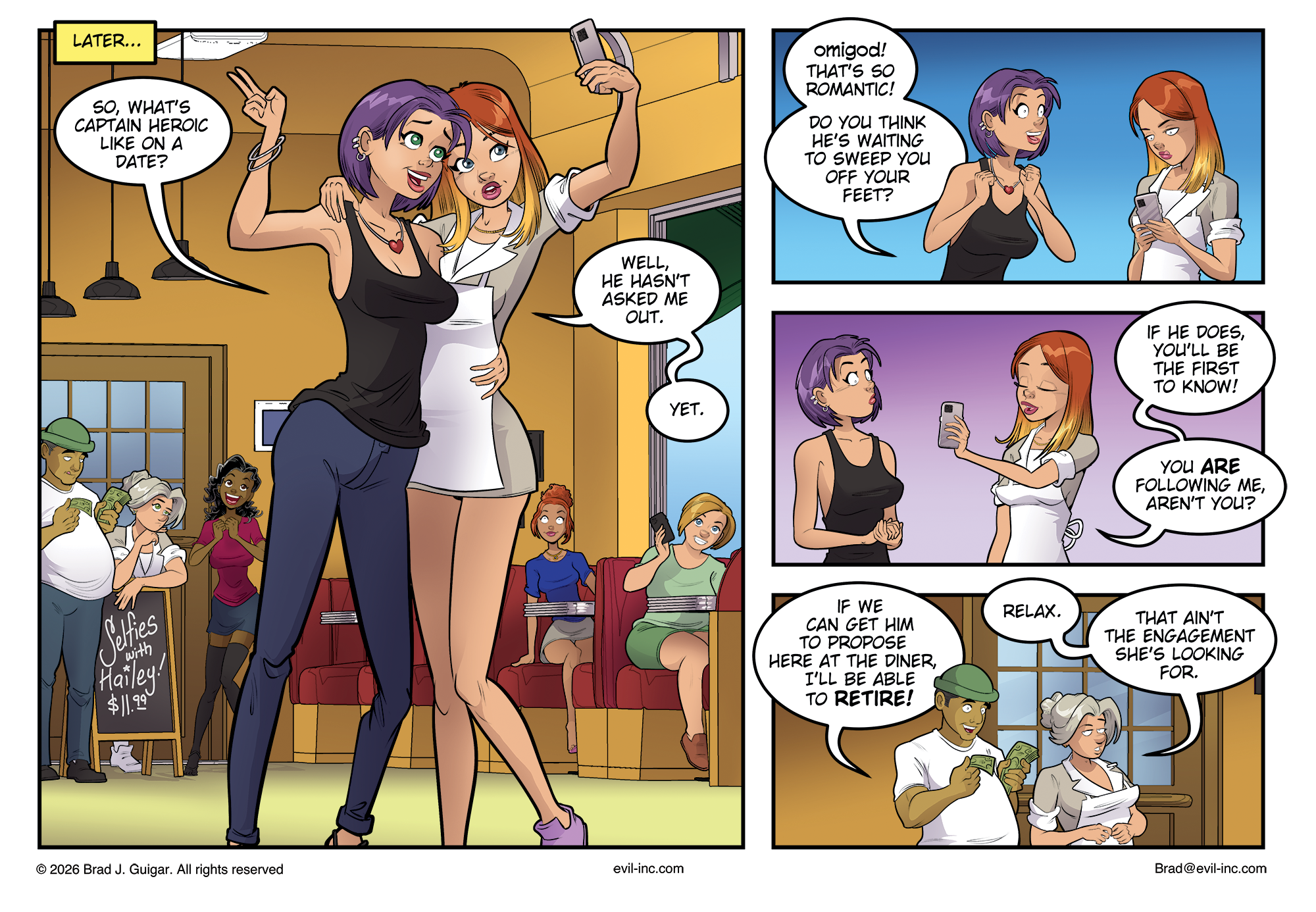 In today’s Evil Inc update, Hailey pauses long enough to take a selfie with a fan — which, naturally, turns into a full-blown interrogation about Captain Heroic. Is he romantic? Is he waiting for the perfect moment? Is a dramatic public proposal imminent? Rosie says Hailey is looking for engagement — but not that kind of engagement!