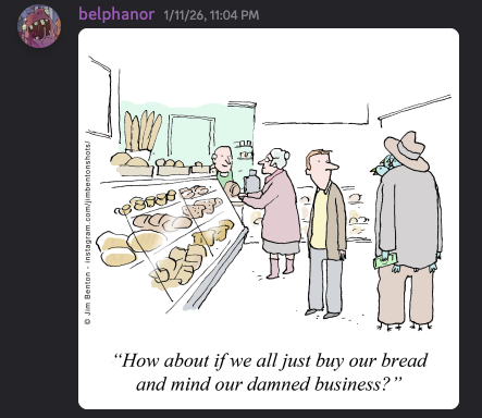 Folks share cartoons they’ve scrolled across and loved (like the recent Jim Benton gem below), mini-reviews of what they’re reading, spicy images they’ve stumbled upon… and yes, sometimes they even talk about Evil Inc.