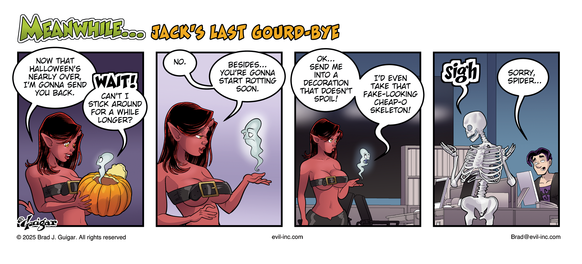 Comic titled "Meanwhile… Jack’s Last Gourd-Bye." Panel 1: Desi, a devil girl with red skin and pointed ears, holds a pumpkin with a small spirit hovering above it. She says, “Now that Halloween’s nearly over, I’m gonna send you back.” The spirit pleads, “WAIT! Can’t I stick around for a while longer?” Panel 2: Desi replies sternly, “No. Besides… you’re gonna start rotting soon.” Panel 3: The spirit floats above Desi’s hand, saying, “Ok… send me into a decoration that doesn’t spoil! I’d even take that fake-looking cheap-o skeleton!” Panel 4: The skeleton of Spider MacKenzie, stands slumped in front of a desk with a defeated look and a speech bubble reading "sigh". Behind him, Iron Dragon looks apologetically at him and says, “Sorry, Spider…”