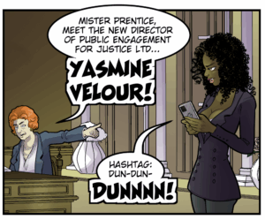 To get yourself reacquainted with Ms Velour, check out her first appearance in Chapter 7 / Evil Inc eComic #49. She resurfaced later in Chapter 11 / Evil Inc eComic #54 / Evil Inc After Dark #54. Her presence at Justice Ltd is sure to cause a stir. Just ask Jeremy.