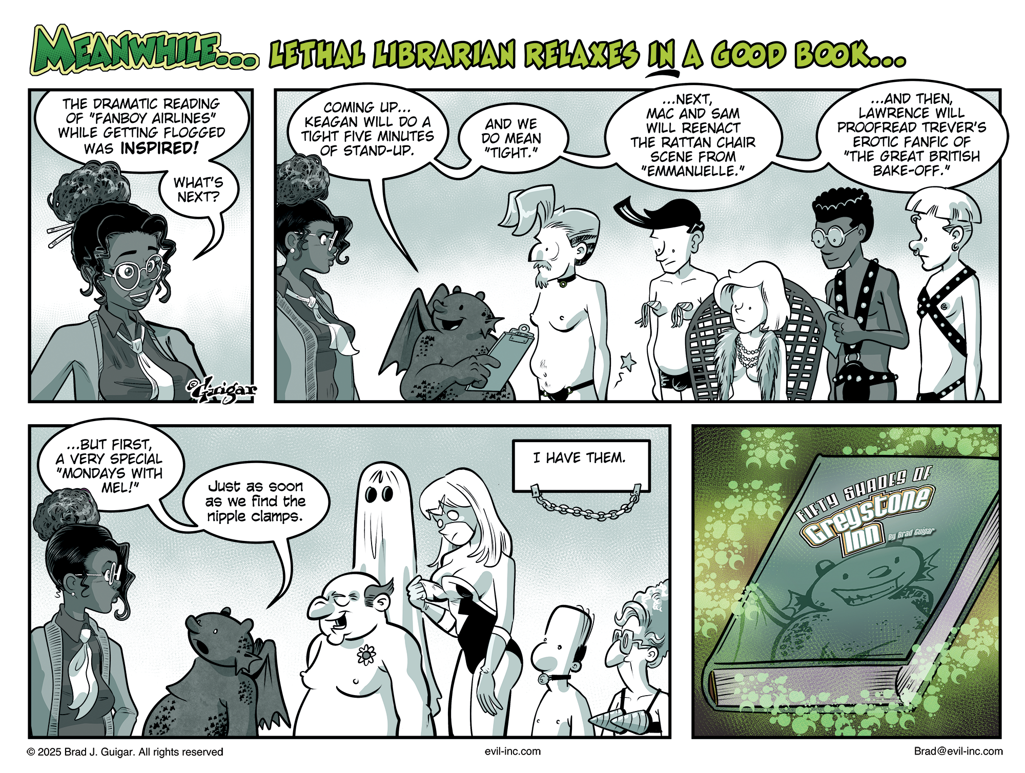 For those of you who joined the fun more recently, Greystone Inn was my very first daily comic strip — a comic strip about a comic strip starring a gargoyle. It’s the strip that eventually evolved into Evil Inc. In fact, Lightning Lady was originally a Greystone character.