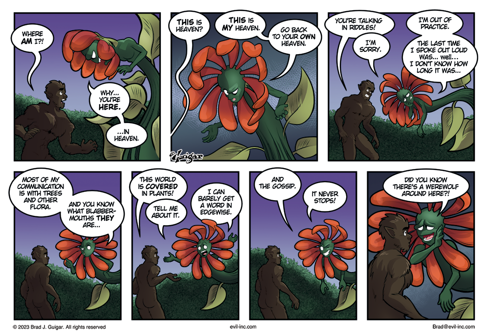 Dark Seed: I'm sorry. I'm out of practice. The last time I spoke out loud was... well... I don't know how long it was. Most of my communication is with trees and other flora. And you know what blabbermouths they are.