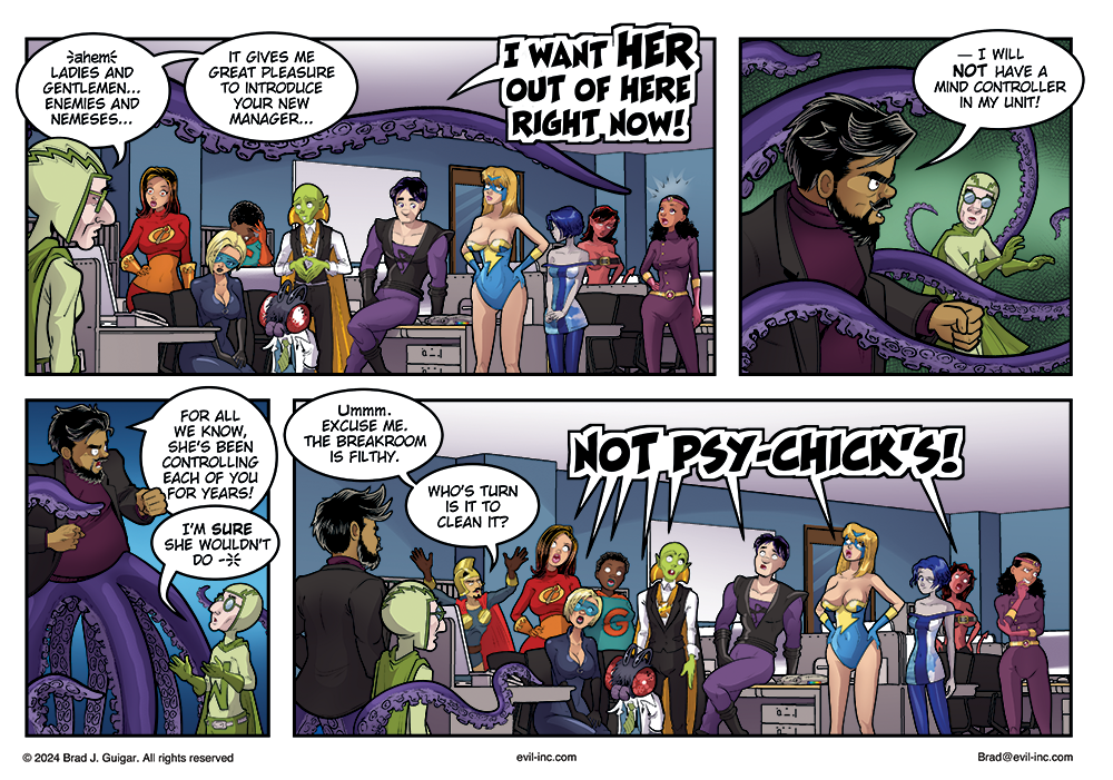Dr. Whoosh, the CEO of Evil Inc speaks in front of a gathering of employees from the Fairmount branch that includes (from left): Miss Match, Catnip, Giant Tess, Dr. Muskiday, Count Spurlock, Iron Dragon, Lightning Lady, Tempest (Dr. Whoosh's assistant), Desdemona and Psy-Chick.