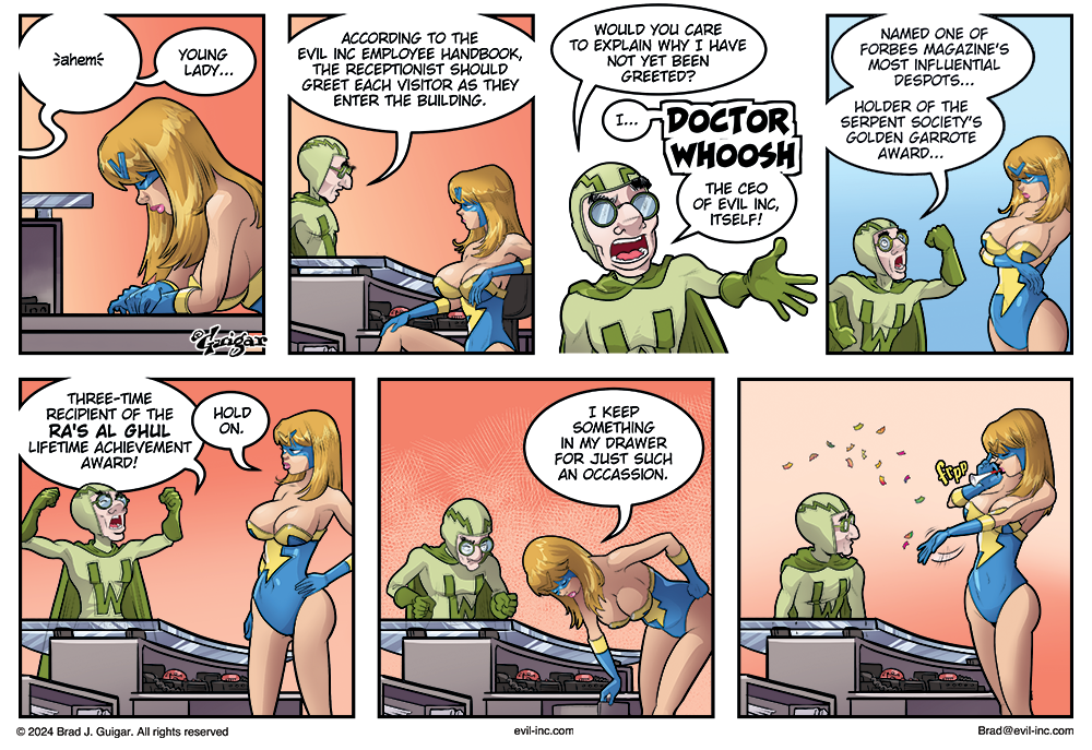 It's an elderly supervillain: "According to the Evil Inc Employee Handbook, the receptionist should greet each visitor as they enter the building.
